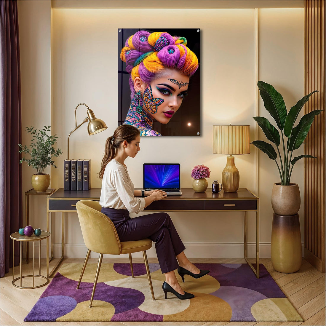 ¿Existe un “lugar correcto” para una pieza tan expresiva? Los interioristas parecen divididos. Algunos aseguran que los recibidores están hechos para el arte protagonista—al fin y al cabo, ¿qué mejor lugar para marcar el tono de todo el hogar? Otros creen que los salones, tocadores o estudios creativos pueden ser escenarios más apropiados, donde el arte pueda interactuar con paletas de maquillaje llenas de color, espejos dorados y un poco de drama.