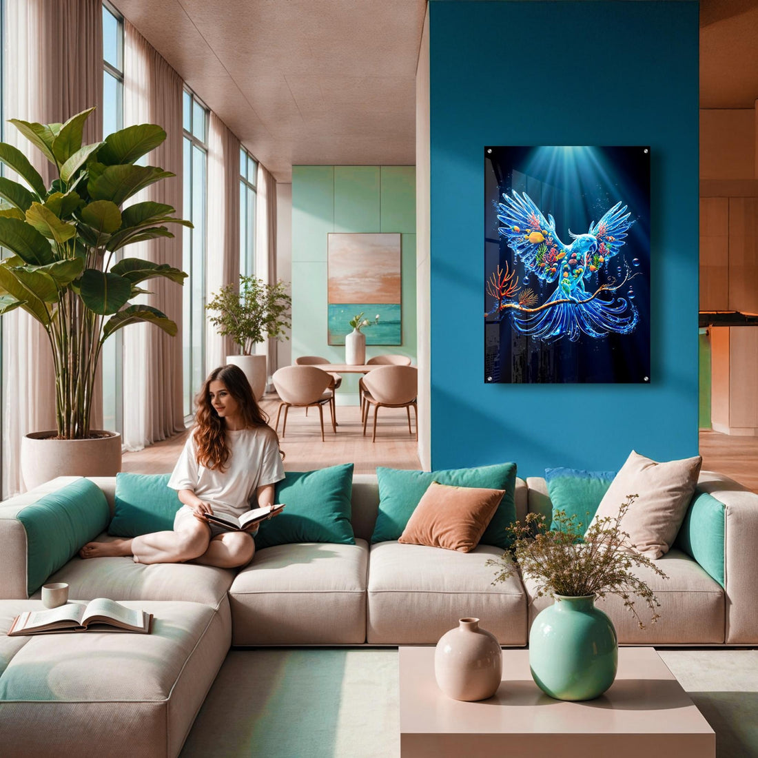 Certains jours, une pièce paraît terne, comme s’il lui manquait un peu de vie. C’est sans doute pour cela que le tableau acrylique Perroquet d’Eau attire tant mon regard. Ce n’est pas une œuvre discrète. Dès le premier coup d’œil, on rencontre un perroquet sculpté dans l’eau, ailes déployées et dégoulinantes, chaque plume se transformant en bouquets de corail et poissons vifs. Je l’avoue, tout le monde n’aura pas envie de tant de couleurs sur son mur—mais est-ce vraiment un défaut ?
